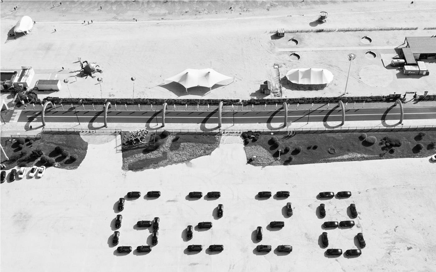 在大连金石滩主会场发车仪式上,自驾车队的车辆摆出“G228”图案。图片由活动主办方提供